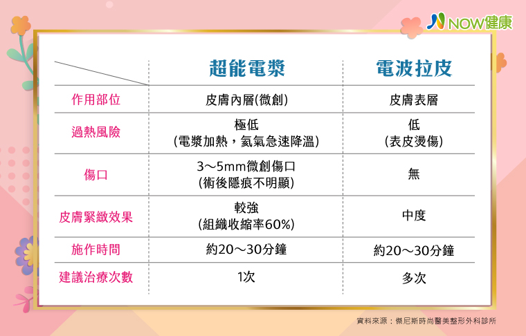 ▲超能電漿和電波拉皮比較一覽表。(資料來源/傑尼斯時尚醫美整形外科診所;圖/NOW健康製作)