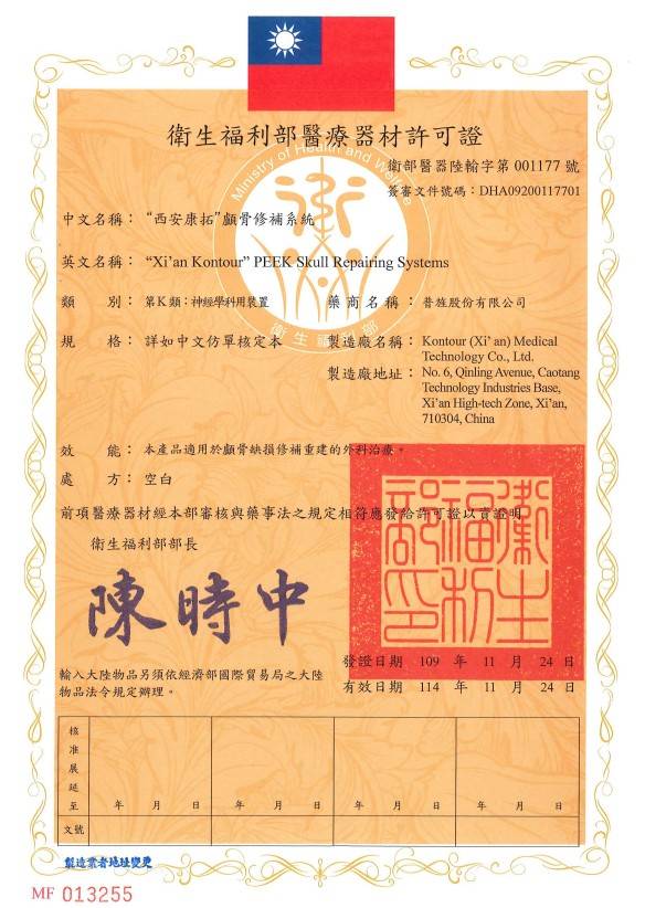 2. “西安康拓”顱骨修補系統“Xi’an Kontour” PEEK Skull Repairing Systems,醫療器材許可證字號:衛部醫器輸字第001177號。