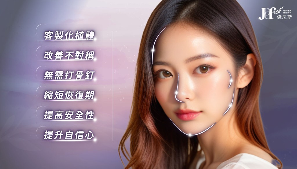 - 3D列印製作:3D列印技術更讓人工骨貼合人體,因此大幅度降低骨侵蝕風險、植體位移、彎曲等併發症,打造流暢自然線條及塑造高貴的黃金比例弧度。
