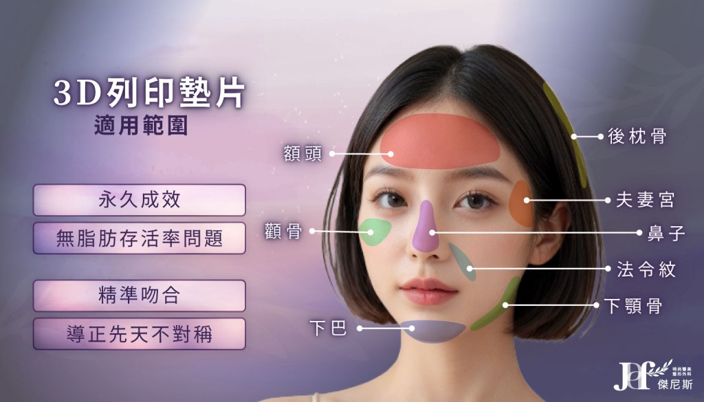 - 夫妻宮:與針劑填充或脂肪植入效果不同,3D列印墊片效果永久,透過電腦斷層掃描數據分析骨骼、軟骨和皮膚肌肉等人體組織,以製造精準吻合的植入物。