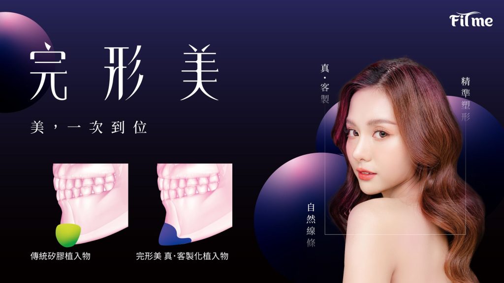 透過智慧醫療興起,透過3D列印設計結合顧客的電腦斷層資料與醫師設計方向,更快速打造出客製化臉部植入物,目前市面上常見的3D列印植入物有:Fitme\完形美(矽膠)、煥體(聚醚醚酮),由於是根據電腦斷層資料所製造,有別於傳統制式植入物需透過醫師手工雕塑現有量產型公版植入物進行塑形,往往耗費大量手術時間,同時增加細菌感染風險性、長時間的手術過程伴隨高併發症風險,也可能因術中塑形不精確,導致需面臨二次重修的可能。