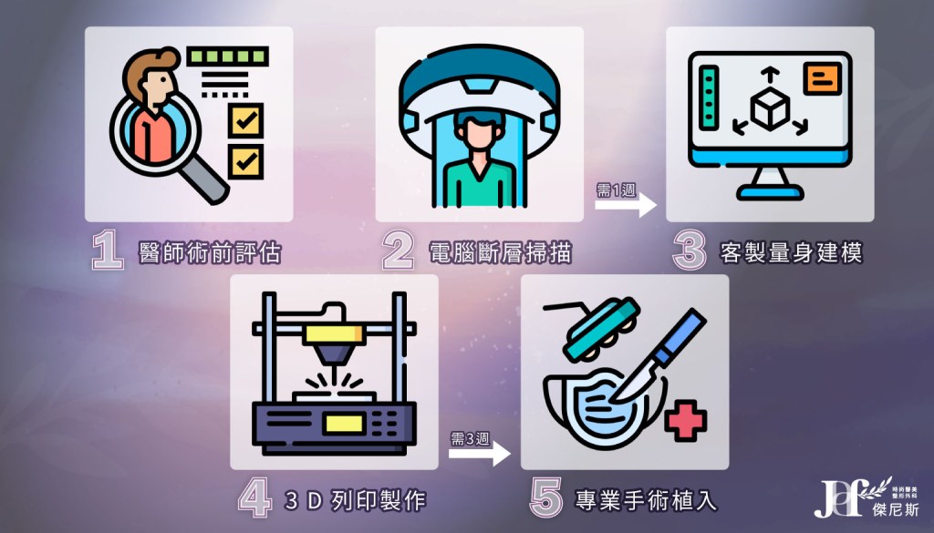根據電腦斷層掃描及數據分析出屬於該顧客的面部數據,醫師根據數據設計出1:1客製化植入物模型,並通過3D列印技術製作植入物,大幅減少植入物移位、攣縮和骨侵蝕的風險。也適用於重修手術的專屬客製化植入物,在重修的情況下,考量已植入的植入物形狀和尺寸,再精確設計新的植入物,例如傳統矽膠鼻模容易有不緊貼骨頭,造成在拍照時出現透明感,透過3D列印量身定做的鼻模,精準塑形能將額頭到鼻樑線條變得柔和自然,同時降低彎曲或移位等併發症。主要流程如下:
