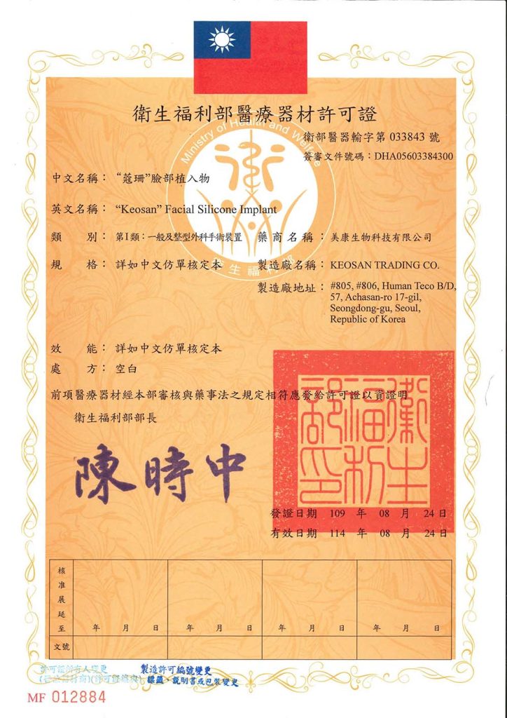 1. “蔻珊”臉部植入物“Keosan” Facial Silicone Implant,醫療器材許可證字號:衛部醫器輸字第033843號。